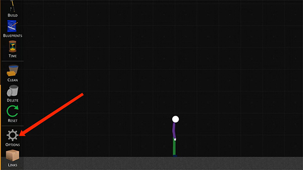 1、打开火柴人沙盒游戏,滑动左边工具栏,选择英文OPRIONS【齿轮】图标选项,
