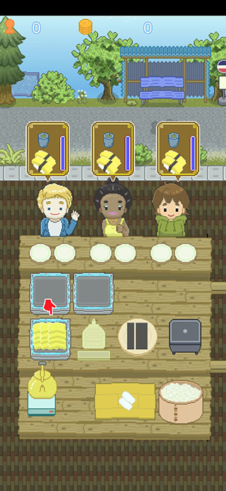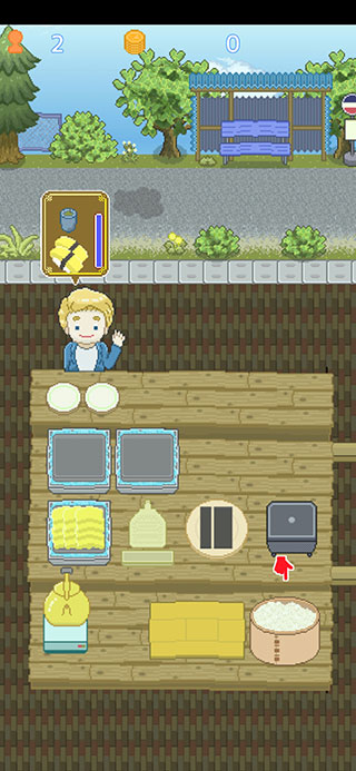 9、玩法非常简单,我们看到顾客需要一个鸡蛋和一杯茶,旁边还有时间,现在开始制作,先点击饭团,