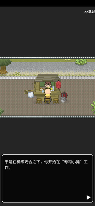 1、打开寿司小摊游戏,进入游戏剧情动画,点击跳过即可继续,