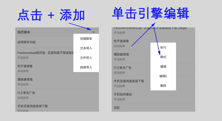 该应用暂时兼容了油猴的部分API,对于大部分适配手机版本的油猴脚本目前是可用的,往后版本逐渐完全兼容。操作方式首先进行添加创建脚本,然后单击引擎编辑。若已下载油猴脚本JS文件,将其存放到 M浏览器/脚本 目录后重启M浏览器即可使用。