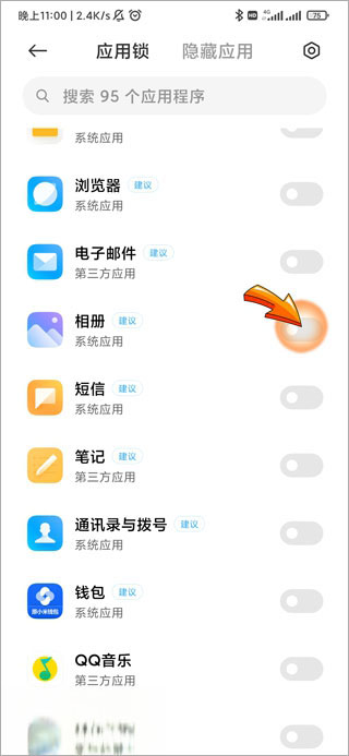 3、最后找到相册,将开光勾选上就可以设置密码了。