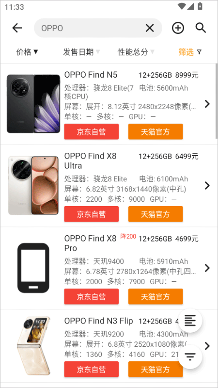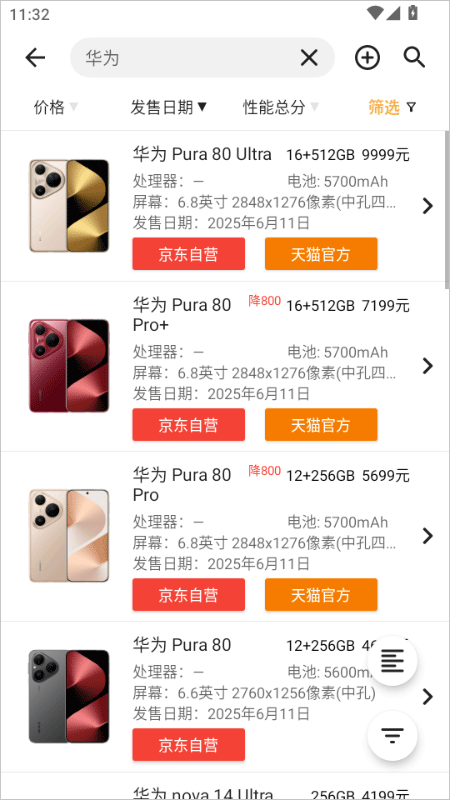 3、降价/新机:快速浏览当前京东自营、天猫官方商城的标配版价格。