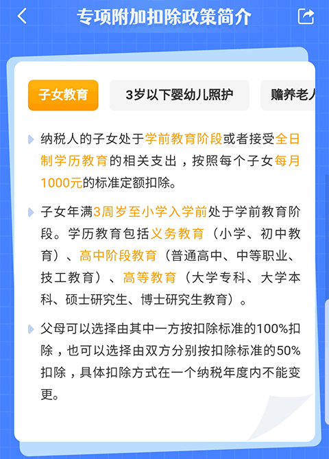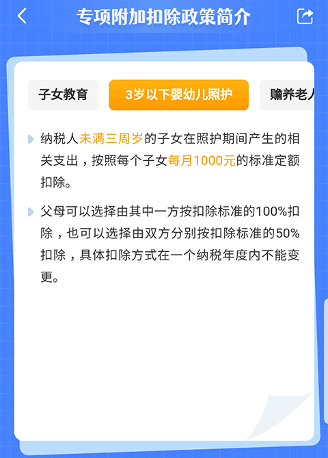 个税专项附加扣除app是国家税务总局针对个人用户而开发的一款手机专项附加扣除软件,正式名称叫做个人所得税app,又俗称为个人所得税专项附加扣除app,个税扣除app等等,目前包括7项个税专项附加扣除,分别是子女教育、继续教育、大病医疗、住房贷款利息、住房租金、赡养老人,以及今年3月新纳入的“3岁以下婴幼儿照护”项目。其中3岁以下婴幼儿照护方面,按照每名婴幼儿每月1000元的标准定额扣除,一年一共12000元,无论婴儿在国内还是国外出生,都可以享受扣除。父母可以选择由其中一方按扣除标准的100%扣除,也可以选择由双方分别按扣除标准的50%扣除,即一人每月500元扣除,具体扣除方式在一个纳税年度内不能变更,有多子女的父母可以对不同子女选择不同的扣除方式。