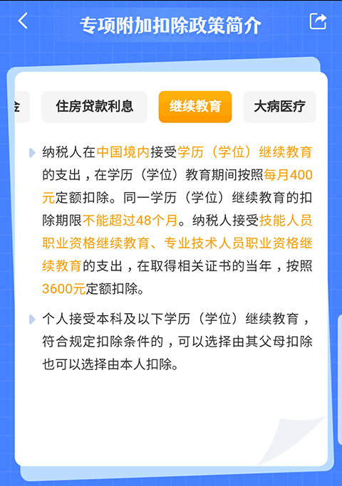 纳税人在中国境内接受学历(学位)继续教育的支出,在学历(学位)教育期间按照每月400元定额扣除。纳税人接受技能人员职业资格继续教育、专业技术人员职业资格继续教育的支出,在取得相关证书的当年,按照3600元定额扣除。