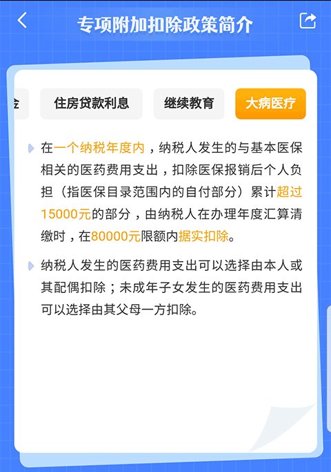 在一个纳税年度内,纳税人发生的与基本医保相关的医药费用支出,扣除医保报销后个人负担(指医保目录范围内的自付部分)累计超过15000元的部分,由纳税人在办理年度汇算清缴时,在80000元限额内据实扣除。