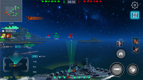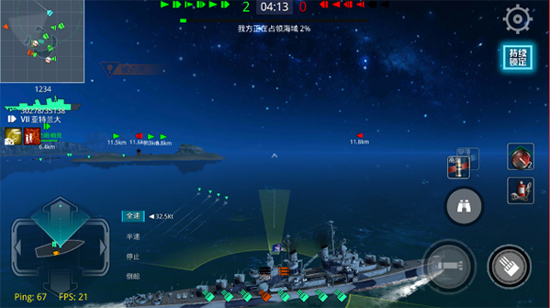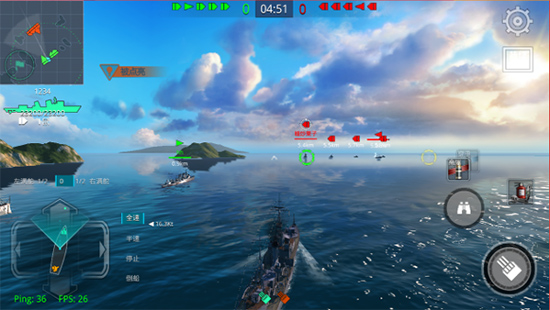 航行操作是通过上下速度档位和左右方向键来实现的,玩家只需要通过上下键在全速、半速、停止、倒船四个档位中进行选择,使用左右键任意调整方向就可以实现战舰的航行,简单的操作却能让你体验真实的战舰航行,享受海战带来的激情。