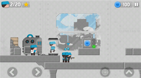4、博士会复制克隆自己的小兵,玩家可以控制,左边控制小兵的方向,右边控制射击和上跳;