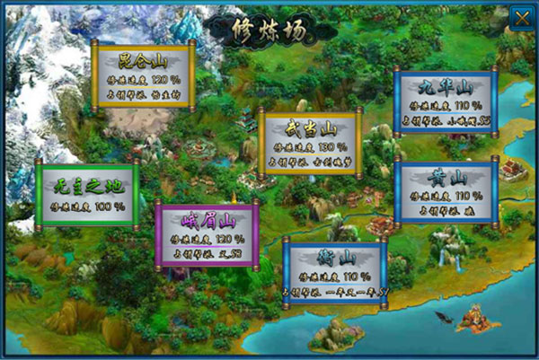 其他六座名山在没有帮派占据时为固定的修炼空间30个,用户进入挂机修炼为名山默认的加成速度,其中峨眉和昆仑山的基本速度提升20%,其他4座基本速度提升10%