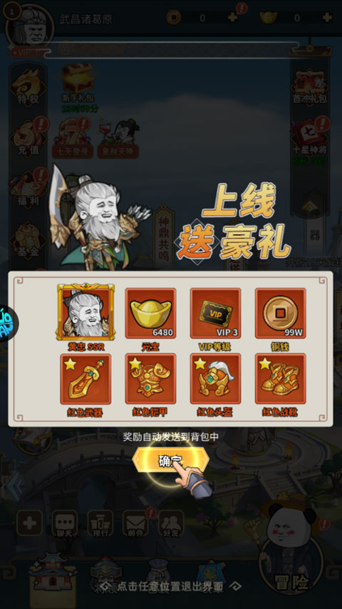 1、上线送黄忠*1,VIP3,元宝*6480,铜钱*100w,红色1星4件套*1
