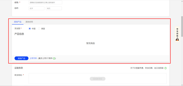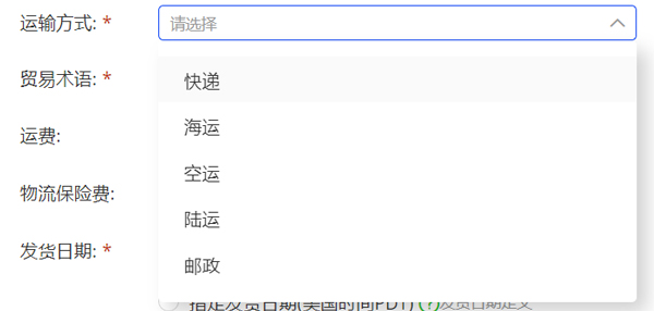 b. 运输方式:可以选择空运、海运、快递、陆运、邮政大小包五种运输方式,选择后会出现“运费”填写框,填写后会自动计入订单总价中。