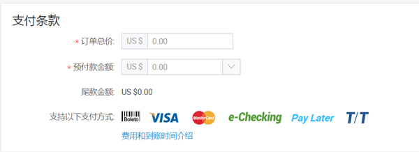 4)支付条款:预付款必须≥1美金,起草订单时,统一用美金核算。