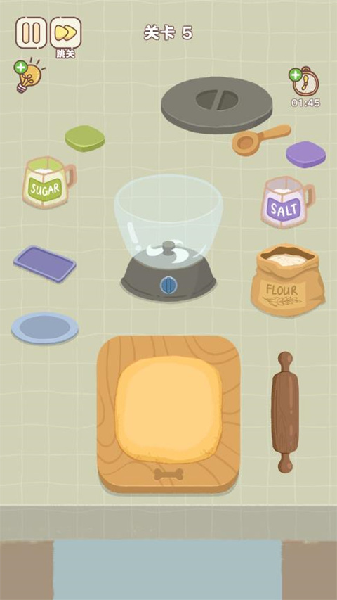 2、然后用擀面杖擀出面饼,记得将所有物品归置原位