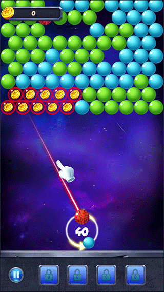 2、游戏的玩法非常简单,你只需要单个手指拖动屏幕即可根据复制的射线发射小球,3个相同颜色的小球相接即可消除,一次性消除的小球越多,得分也就越高;