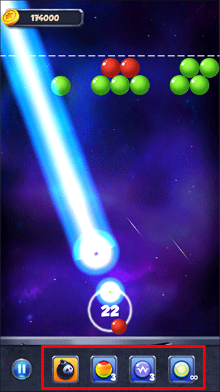 【闪电球】发射出一枚闪电球,接触其它球时,召唤出一条闪电消除一排的小球;