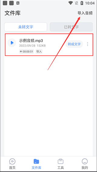 2、在“文件库”页面您可以看到所有文件,如果需要转换的文件不在此目录中,您还可以点击右上角的“导入音频”功能导入;