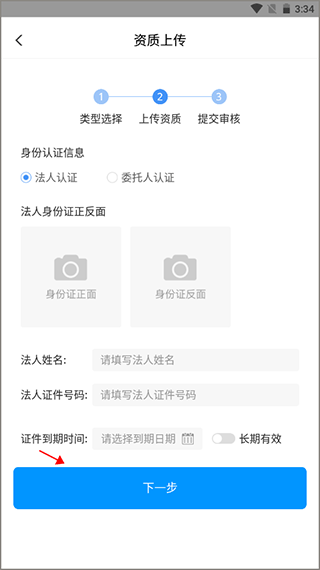 4、填写企业法人的身份证信息,上传身份证证件照片,点击下一步之后就对信息进行审核,审核成功后就表示认证成功了。
