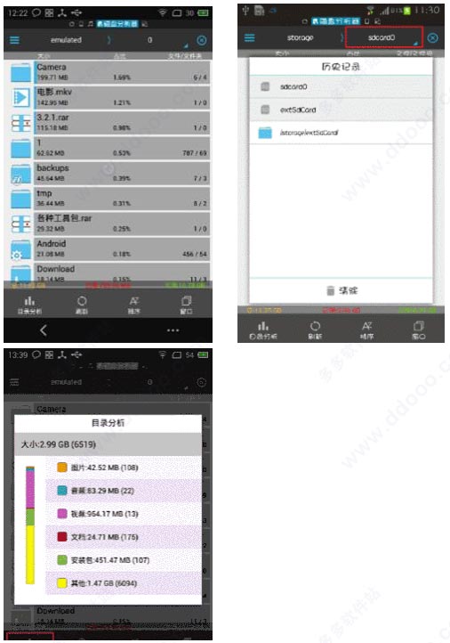 打开快捷导航—工具—磁盘分析器,能够显示sdcard总容量,已用可用容量,各个文件夹/文件的大小、占比、所包含文件/文件夹数量,长按可以直接删除。点击地址栏可以切换内置外置卡。点击目录分析,可以显示当前路径下的图片、音频、视频、文档、安装包、其他所占容量的情况。