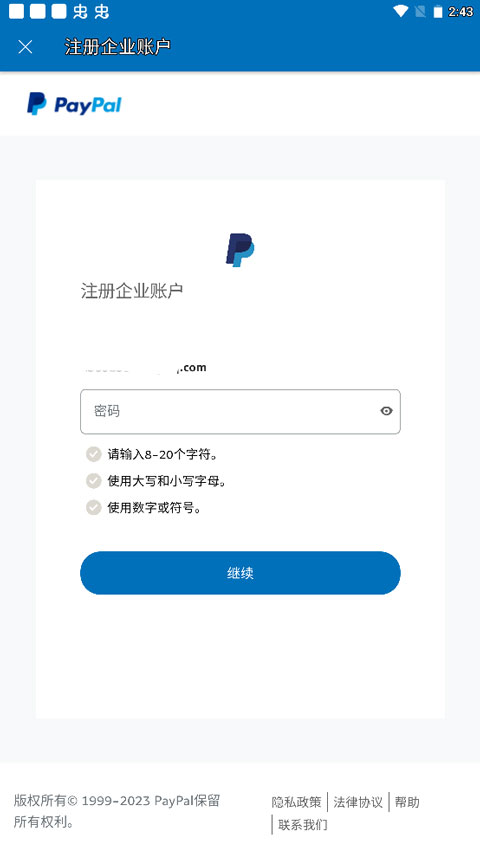 4、确认自己的邮箱账号后,设置一个密码,点击继续;