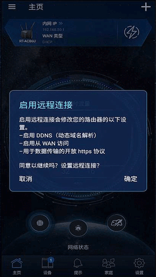 11、进入路由器设置页面后,会提示“启动远程连接”,若需要在外网通过华硕路由器APP访问路由器设置页面请点击“确定”。