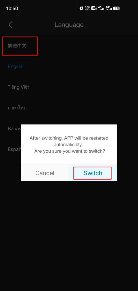 3、选择语言为【繁体中文】,系统会提示你是否切换,点击【Switch】确认;