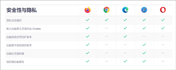 从上面的图表可以清晰看出,Firefox 内置了五款浏览器中最完整的隐私和安全工具,并提供有关您整体在线安全和隐私摘要信息的面板。