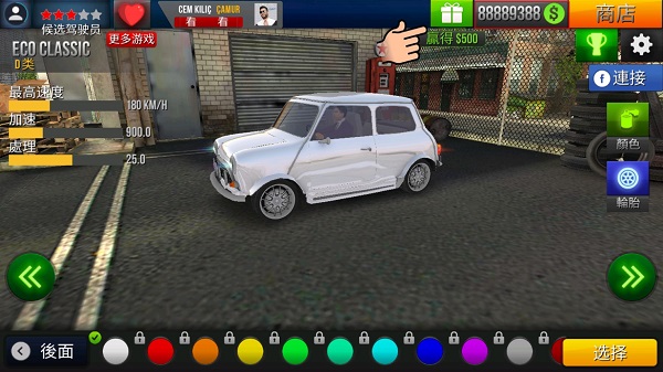 进入后,你可以通过下方绿色条左右切换,挑选令你满意的车型,如果觉得车身颜色不好看,可以自定义改装车身颜色,同时你还可以选择“轮胎”,更换轮毂。