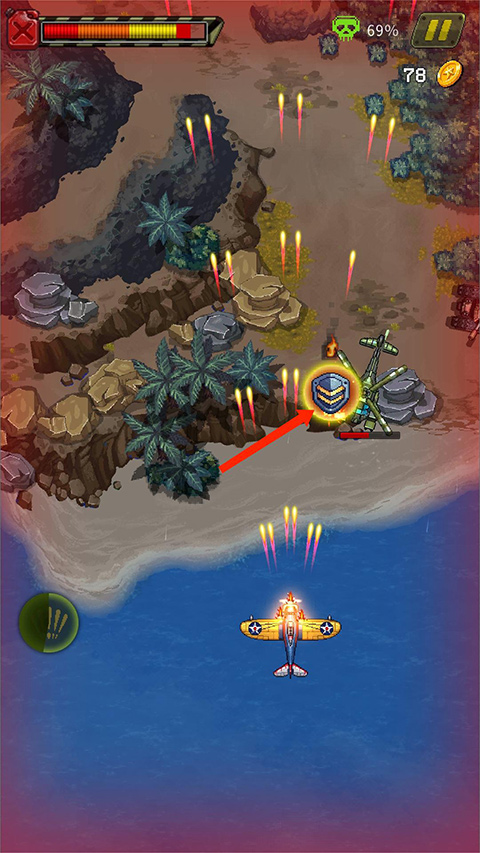 5、在战斗的过程中还有不同的功能会出现,帮助我们更好的战斗,当前出现了【盾牌】图标,接到后即可形成保护圈,用于抵挡敌机的子弹,