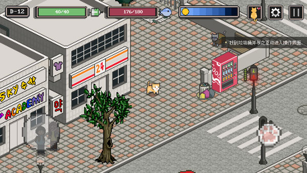 翻找垃圾堆、纸箱、罐头获取食物与道具,拿到道具后点击即可食用,将特定道具送给NPC可增加好感度,交给门口的猫咪可升级猫窝,获得更多体力健康与对话次数。