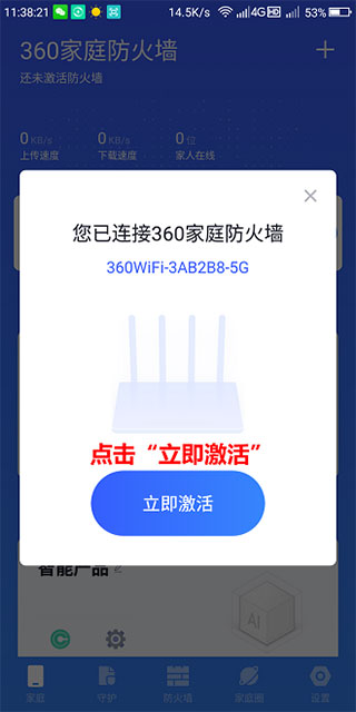 4、打开已登录帐号的防火墙app,在弹窗上点击“立即激活”按钮(也可通过点击右上角的“+”按钮,搜索并绑定防火墙)。