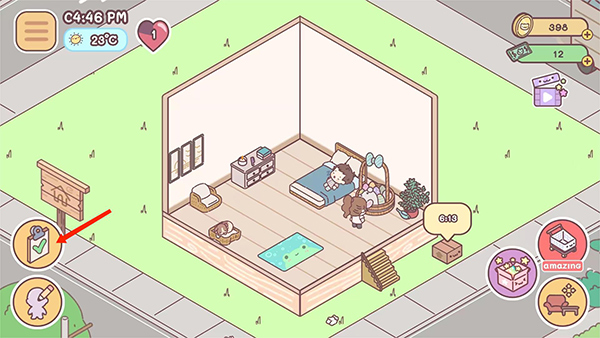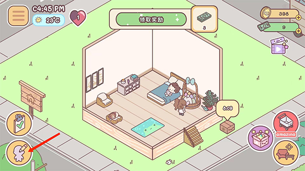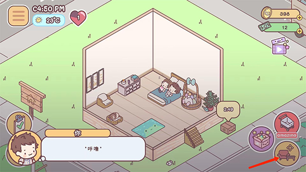 4、进入游戏主界面按照提示,拖动盆栽、沙发和柜子,移动到指定的位置,完成新手任务后,就是自己来布置这个有爱的小家了,