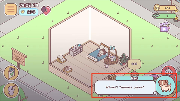 4、返回袋中爱游戏界面,点击宠物,可看到右下角出现宠物的对话框,以上就是袋中爱和宠物打招呼的方法了。