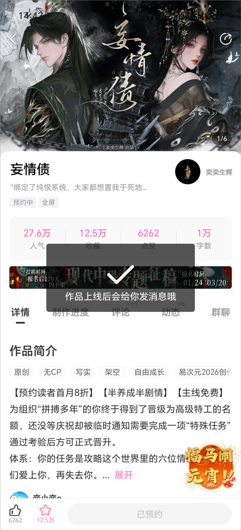 2、点击进入作品,然后点击下方立即预约;