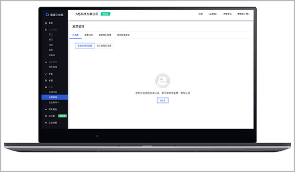 1、开发票前需要先完成企业资质认证,请前往左侧边栏“发票管理”,点击“去认证”。