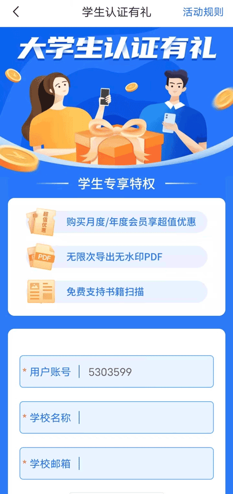 2、如果你是大学生的话,还可以进行大学生认证,大学生认证有礼,可享受无限次导出无水印PDF并且支持书籍扫描。