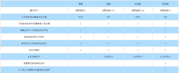 会员共设四个级别:银级、金级、白金级、钻石级。每个级别的会员各可尊享一系列旅游礼遇。