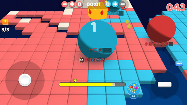 对于游戏的玩法,总的来说还是属于比较容易上手的那种,左侧移动,右侧跳跃非常的中规中矩,与一般的Io游戏相类似,同样以控制球球通过吃豆豆来变大,但与之区别的就属跳跃能够以十字的形式占据周围的领地面积,在这些面积上会随机出现豆子,且移动速度增加。