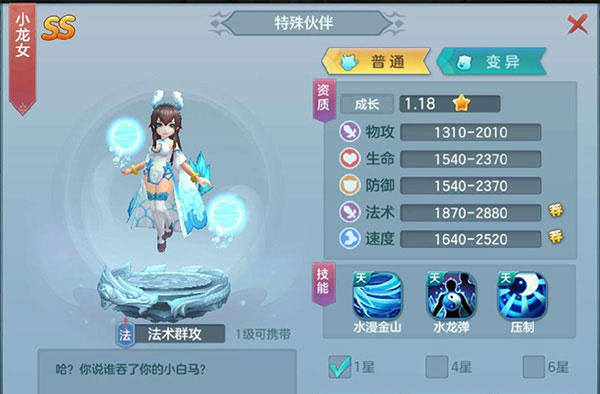 1、先给大家说一下小龙女,这个是通过一个首冲礼包获得,很划算的才6元,关键是还送你5元代金卷,所以你只需要花1元就好啦,这个小龙女非常强力,技能是群攻的,一个是随机3个目标 还一个压制可以对眩晕的角色额外造成4.5的伤害,所以这个是所有玩家前期的必备角色!