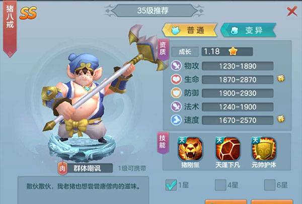 2、第二个猪八戒,登录第二天就送,第一天的时候我会用别的,比如判官,这个就不错,要不是第二天送猪八戒,也许我就用判官了,猪八戒是一个前排肉盾的角色,他的技能会给友方前排加一个护盾,还有一个会提高友方前控%70 ,他的另一个技能就是嘲讽,这样就有几率让别人攻击他了,很牛得肉盾!