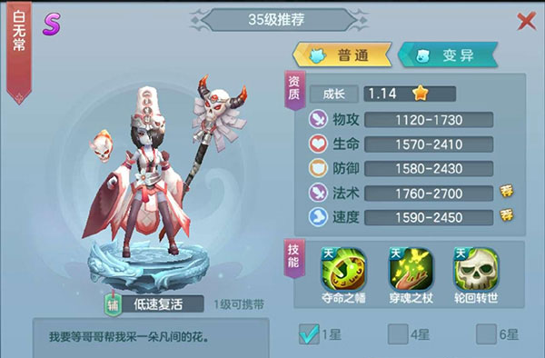 3、第三个黑无常,为什么说这个呢,因为除了,小龙女,猪八戒,这俩SS,别的前期想抽SS除了10连得花钱的,平民想抽只能用元宝一次一次抽,那就是看脸的了……毕竟前期你不能用系统送的A吧,而且游戏元宝很好赚的,黑无常有一个技能很不错,就是轮回转世,死亡一回合后复活,也算是一个不错的技能了!