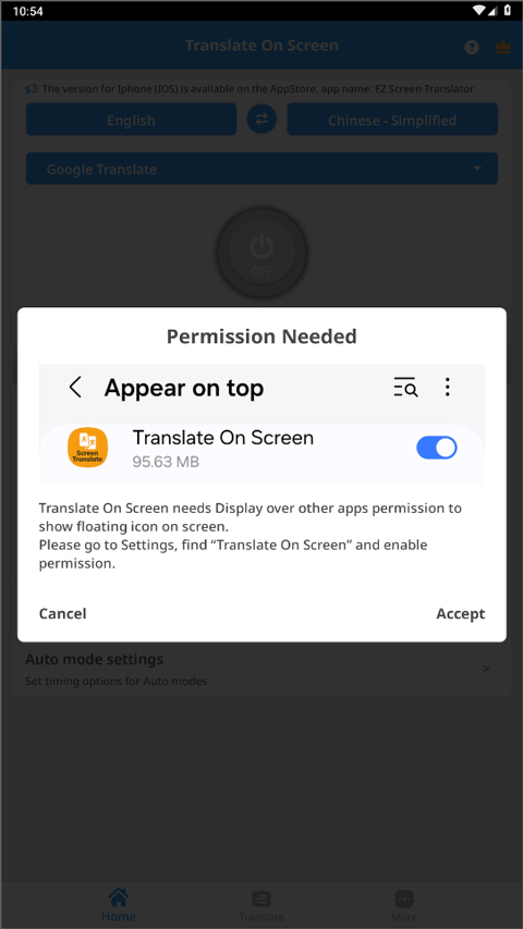 5、选好后点击off,应用会提示需开启悬浮窗权限,跟随引导开启即可;