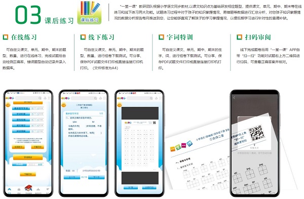 ★字词特训——可自定义课文、单元、期中、期末的生字词,进行下载试题练习。线下完成题卷后用“一堂一课”APP自带的“扫一扫”对试题右上方二维码进行扫码,可查看正确答案并核对。