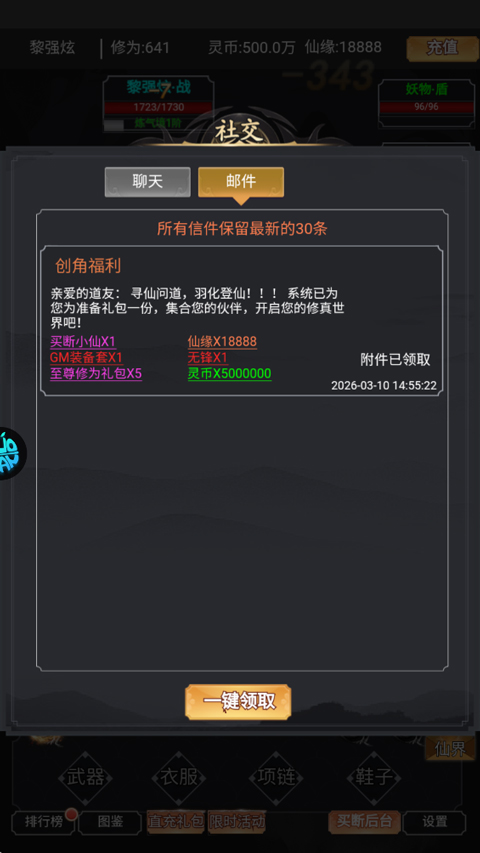 3、沉浸修仙,登陆创角送百万修为。