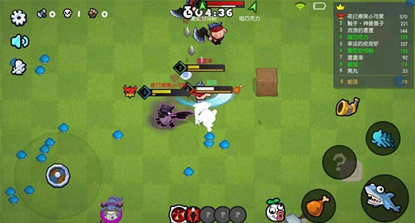 中间下面为技能栏,吃蘑菇捡宝石获得积分会升级,升级会获得三个技能,但只能选择其中一个留下来。右上角为积分排行榜,这是输赢的判断条件,积分最高的获胜。游戏中也可以用语音,也可以用这个号角发送信号消息。