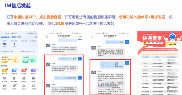 打开中通快递app,点击售后客服,即可看到您专属的售后服务群聊,您可以输入运单号+诉求发送,机器人将会进行自动受理,也可以批量发送运单号+诉求进行售后发起。
