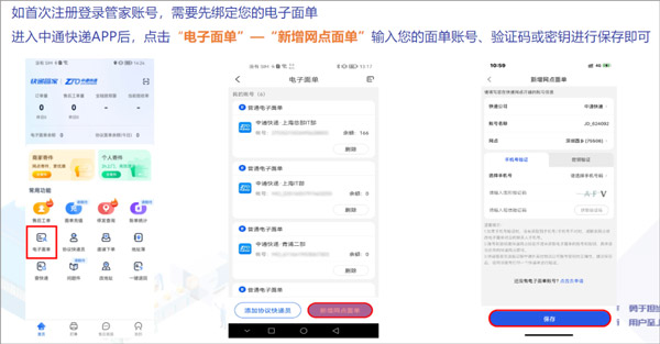 如首次注册登录管家账号,需要先绑定你的电子面单;进入中通快递app后,点击“电子面单”—“新增网点面单”输入您的面单账号、验证码或密钥进行保存即可。