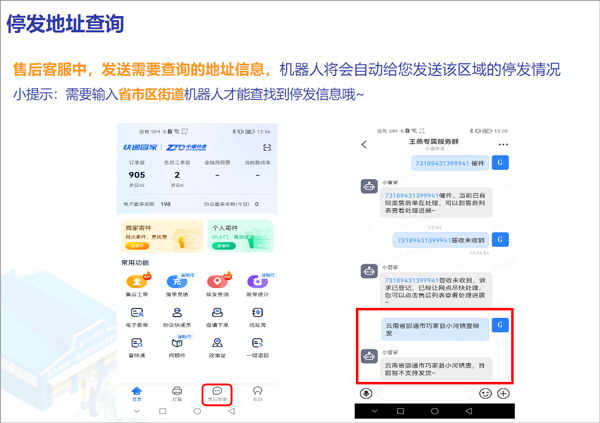 售后客服中,发送需要查询的地址信息,机器人将会自动给您发送该区域的停发情况。(小提示:需要输入省市区街道,机器人才能查找到停发信息。)