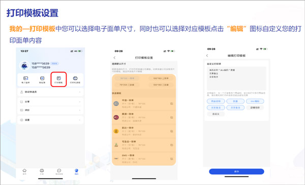 我的—打印模板中可以选择电子面单尺寸,同时也可以选择对应模板点击“编辑”图标,自定义您的打印面单内容。