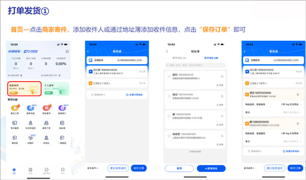 首页—点击商家寄件,添加收件人或者通过地址簿添加收件信息,点击“保存订单”即可。