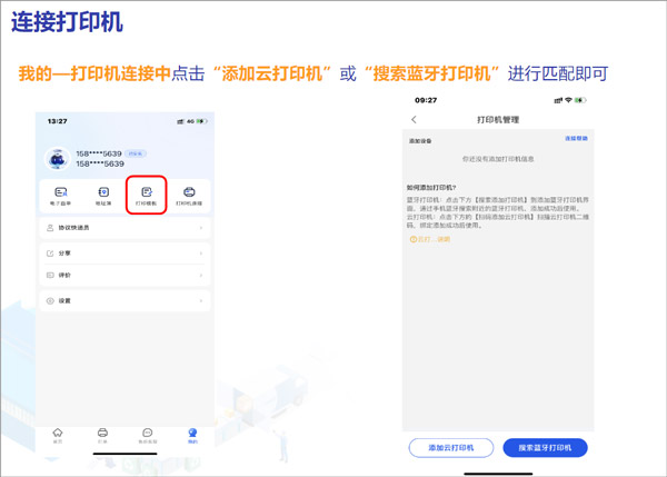 我的—打印机连接中点击“添加云打印机”或“搜索蓝牙打印机”进行匹配即可。