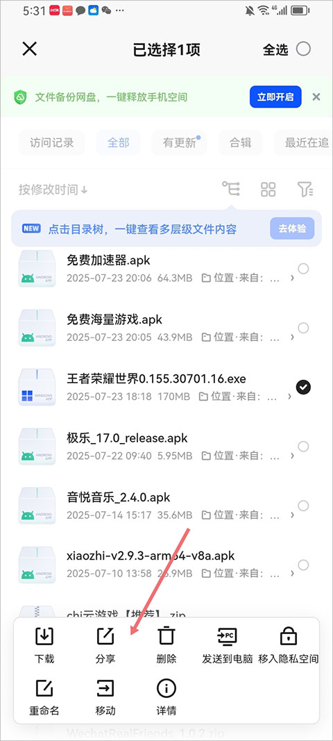 1、在app中选择要保存到百度网盘里的文件长按选中,接着点击界面下方弹出的分享按钮